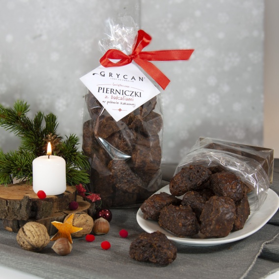Pierniczki z bakaliami (14%) w polewie kakaowej (28%)